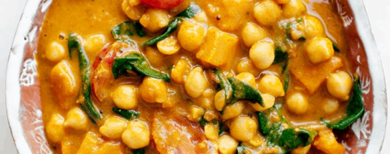 Ugotować ciecierzycę lub użyć ciecierzycy z puszki. W szerokim garnku na łyżce mleka kokosowego poddusić pokrojoną w kosteczkę cebulę, dodać starty imbir i czosnek i chwilę podsmażyć. Dodać przyprawy i mieszając smażyć przez 2 – 3 minuty, dodając nieco więcej mleka kokosowego gdyby składniki zaczęły przywierać do dna garnka. Powstałą pastę smażyć jeszcze przez minutę. Dodać ciecierzycę wraz z kilkoma łyżkami zalewy, pokrojoną w kosteczkę dynię, passatę pomidorową oraz mleko kokosowe. Wlać pół szklanki wody, doprawić szczyptą soli i gotować pod przykryciem przez 20 minut. W międzyczasie raz przemieszać. Garnek otworzyć i mieszając co chwilę gotować jeszcze przez ok. 5 – 10 minut aż sos będzie kremowy, gęsty a dynia miękka. Dodać szpinak, przekrojone na połówki pomidorki, wymieszać, zagotować i odstawić z ognia.