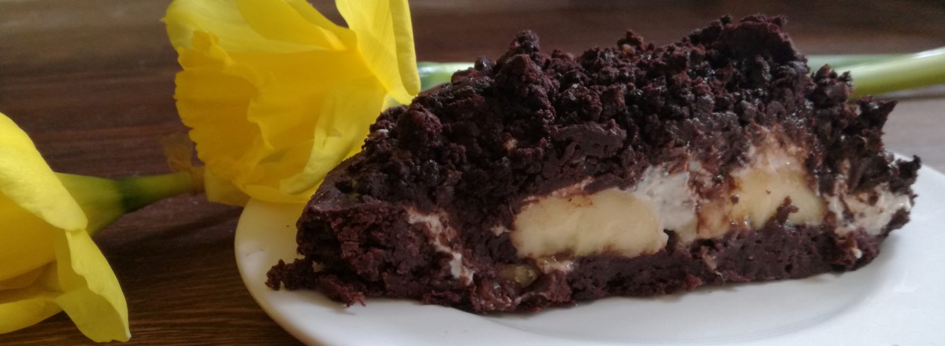 Przygotowujemy krem: jogurt, serek, ksylitol mieszamy i następnie dodajemy pokrojoną wcześniej w kostkę czekoladę. Krem wylewamy na upieczone ciasto w formie kopca. Na wierzch sypiemy rozkruszonym ciastem i lekko docisnąć. Schłodzić w lodówce około 1 godziny.