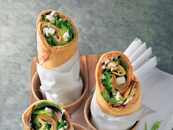 Do miski wbijamy jajka, dodajemy mleko, mąkę, proszek do pieczenia, sól i wodę mineralną. Mieszamy na gładkie ciasto i odstawiamy na bok. Ocieramy skórkę i wyciskamy sok z cytryny. Soczewicę mieszamy z harissą, skórką i sokiem z cytryny, solą, pieprzem i miodem blendujemy na gładką masę. Cukinię kroimy na cienkie plastry i grillujemy na patelni z obu stron. Smarujemy je odrobiną soku z cytryny i oprószamy solą oraz pieprzem. Ser feta kroimy w kostkę. Naleśniki smażymy na rozgrzanej patelni z odrobiną oleju z obu stron. Na każdym naleśniku rozprowadzamy pastę z soczewicy, nakładamy plastry cukinii, rukolę oraz ser feta. Zwijamy w rulon i przekrawamy na pół.