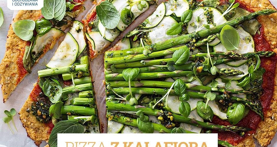 Rozgrzej piekarnik do 180 stopni. Połówkę kalafiora ugotuj (najlepiej na parze) do miękkości. Drugie pół zetrzyj na tarce. Cebulę pokrój w drobną kostkę i zmiksuj na puree z ugotowanym kalafiorem. Połącz ze startym kalafiorem i dopraw do smaku. Całą masę rozsmaruj na blaszce wyłożonej papierem do pieczenia. Piecz przez około 25 minut, aż brzegi pizzy się zarumienią, a środek zetnie. Sos przygotuj według ulubionych składników, najlepiej na bazie pomidorów i warzyw oraz przypraw.