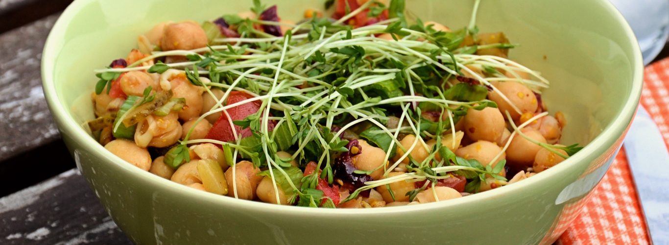 Ciecierzycę namocz przez noc, a następnie ugotuj (sól dodajemy pod koniec, gdy ziarna cieciorki będą już miękkie). Jeśli używasz cieciorki w puszce, odcedź ją ze słonej zalewy. W dużej misce wymieszaj liście roszponki i szpinaku, ciecierzycę, czerwoną paprykę pokrojoną w drobną kostkę. Na suchej patelni upraż pestki dyni. Osobno wymieszaj oliwę lub olej lniany z przyprawami.