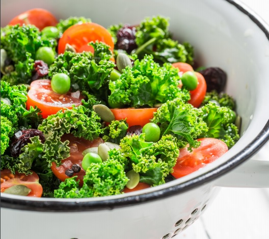 Warzywa dokładnie umyj i osusz. Marchewki obierz i zetrzyj na tarce o grubych oczkach. Pomidorki przekrój w połówki, jarmuż porwij na mniejsze kawałki. Wymieszaj warzywa w dużej misie, posyp bobem i posiekaną natką pietruszki.